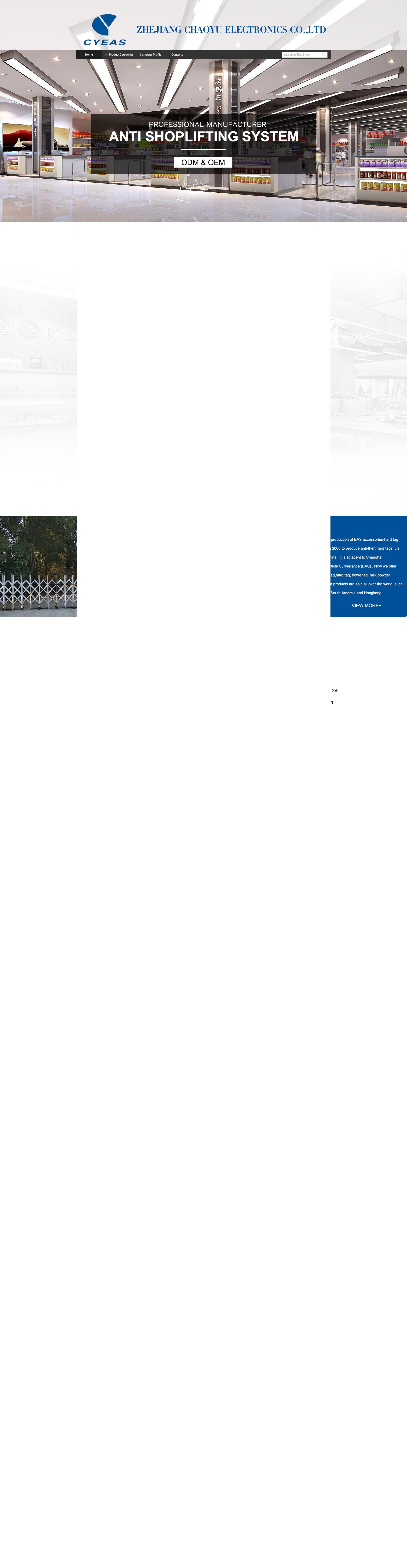 Zhejiang Chaoyu Electronics Co., Ltd., founded in 2008, is a high-tech enterprise focusing on the research, development, production and sales of Electronic Article Surveillance (EAS) products and anti-theft alarm equipments. With more than fifteen years of development, Chaoyu has a complete range of EAS products, including kinds of hard tags, soft labels, EAS safers ,mobile security devices, EAS detection system, decoder and detachers. Our products are widely used in supermarkets, clothing stores, digital stores, cosmetics stores etc. With adopting advanced international standard technology of RF,AM and RFID, our products are compatible with branded systems on the market , such as Sensormatic ,Checkpoint, WG, GATEWAY etc.